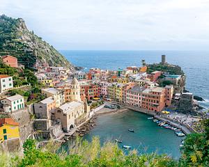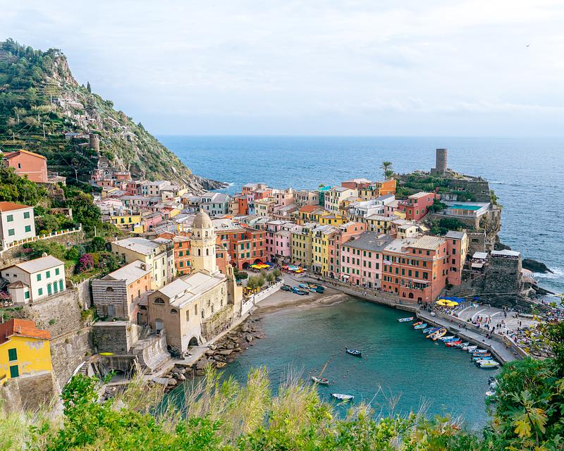 View of Vernazza from the hiking trail that started in Monterosso. Italy / October, 2019.